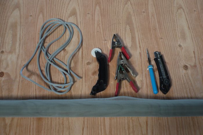 貼り替え用ネット、網押さえゴム、網押さえローラー、クリップ、カッター、千枚通し
